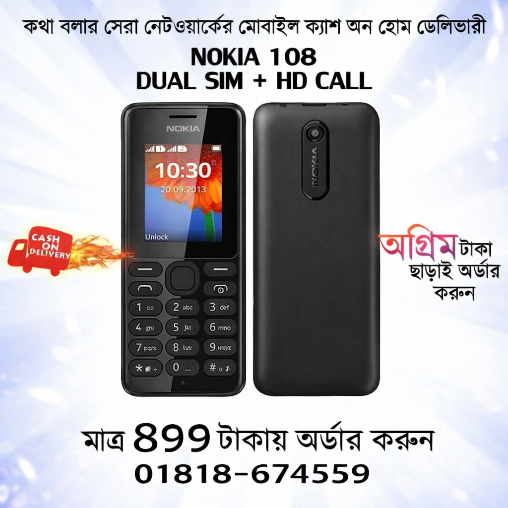 নোকিয়া ১০৮ দুই সিমের মোবাইল এবং এতে মেমোরী কার্ড ব্যবহার করা যায়। এই মোবাইল এক চার্জে ৩ দিন ব্যাক আপ পাওয়া যায়। রাফ ব্যবহার এর জন্য খুব ভাল একটি মোবাইল এটি। অর্ডার করুন, ৬৪ জেলায় মাত্র ৩ দিনের মধ্য ক্যাশ অন হোম ডেলিভারীতে পাবেন।